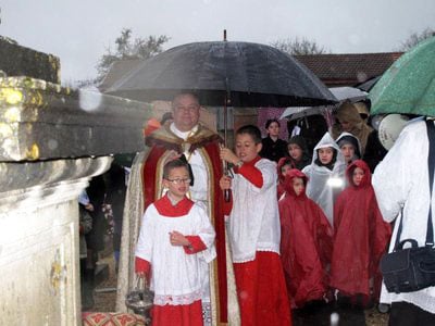 Accompagné par de jeunes porteurs de parapluie, l’abbé Girod, chargé de mener la cérémonie, ouvre sur ces paroles : « Pour que nos morts reposent en paix, pour que la prière des vivants vienne au secours des âmes ». Puis, après avoir rappelé que le nombre de profanations de cimetières chrétiens s’élevait à 408 (selon le ministère) cette année, la longue prière a démarré. Les fidèles, genoux à terre, ont chanté en cœur la réconciliation.