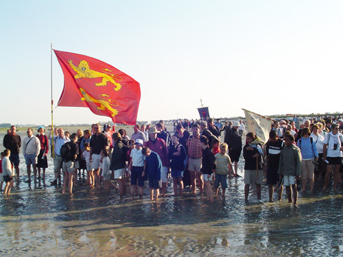 Après le pique-nique sur le sable des grèves, tout le monde se déchausse pour traverser la baie, tel Moïse au Mont Sinaï, comme pour marquer le caractère sacré du lieu. 400 personnes au total se retrouvent sur l’esplanade du Mont, lieu grandiose, au pied des murailles gigantesques sur lesquelles résonnent nos cantiques.