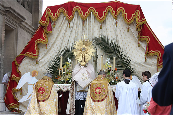 Partant de l’église Saint-Pie X de Marseille le clergé et les fidèles ont processionné dimanche après midi jusqu’à l’arc de Triomphe de la porte d’Aix sous lequel se tenait le reposoir. On pouvait lire sur le fronton de l’arc l’inscription suivante : « à la république, Marseille reconnaissante » alors que le Saint Sacrement était offert à l’adoration publique…