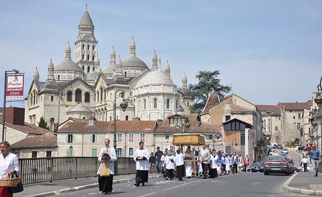 La pro­ces­sion de la Fête-​Dieu aux pieds de la cathé­drale Saint-​Front de Périgueux