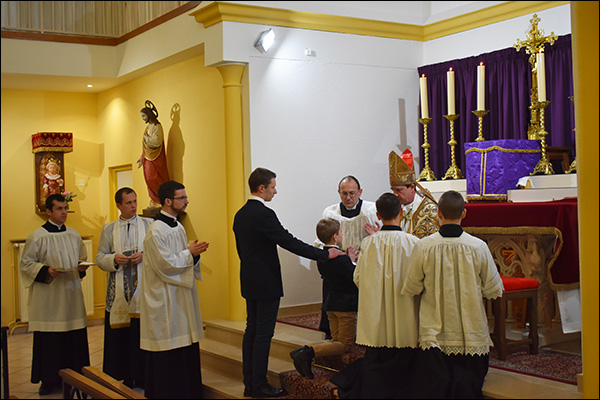 Monseigneur a donné le sacrement de confirmation à 23 fidèles venus des chapelles de Dijon et de Besançon. Son Excellence était assistée de messieurs les abbés Ludovic Girod, directeur de l’école Saint-Jean-Bosco de Marlieux, et Arnaud d’Humières, prieur du prieuré de la Sainte-Famille.