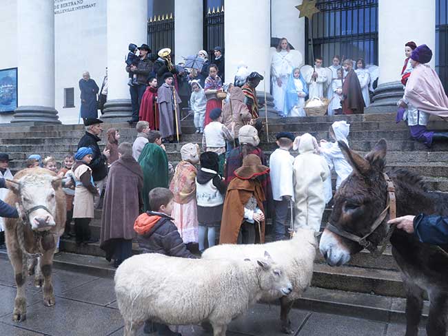 Puis viennent à Lui des rois mages et leur suite, des bergers et bergères, deux vrais moutons et des faux, de vrais biquette, bœuf et âne. Nombres d’enfants costumés entourent Jésus. La chorale, accompagnée de cuivres, chante maints noëls. Monsieur le Prieur déclame la prière de l’âne, mais l’âne lui prend la parole par un retentissant « Han… Hi…Han ! », puis lui cède la parole. Et chantant « Il est né le divin Enfant », tous petits et grands reçoivent près de Jésus quelques gâteries. « Joyeux anniversaire Jésus ! »