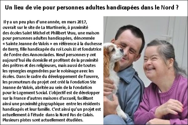 Il y a un peu plus d’une année, en mars 2017, ouvrait sur le site de La Martinerie, à proxi­mi­té des écoles Saint-​Michel et Philibert-​Vrau, une mai­son pour per­sonnes adultes han­di­ca­pées, dénom­mée « Sainte Jeanne de Valois » en réfé­rence à la duchesse de Berry, fille han­di­ca­pée du roi Louis XI et fon­da­trice de l’ordre des Annonciades.