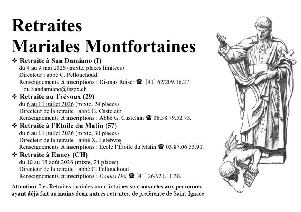 Inscrivez-vous dès maintenant à votre prochaine retraite prêchée par les prêtres de la Fraternité Saint-Pie X, en France ou en Suisse.