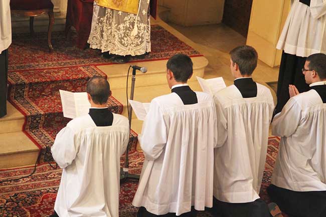 Monseigneur de Galarreta était entouré à l’autel de Messieurs les abbés Patrick TROADEC, directeur du séminaire (prêtre assistant), Pablo SUAREZ, économe général (1er diacre assistant), Olivier du CHÀTELET (2e diacre assistant), Michaël DEMIERRE (diacre), Eric PERON (sous-diacre), tandis que Frère Jean-Baptiste RAME faisait office de sous-diacre porte-croix.