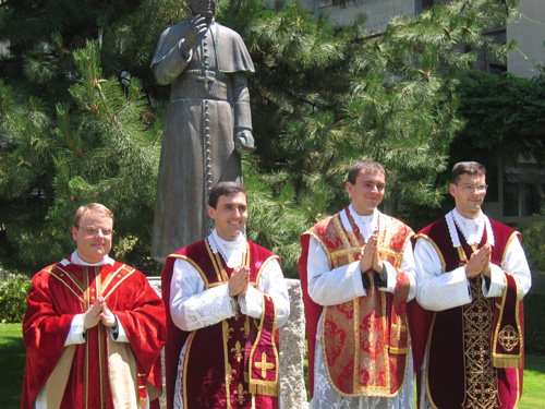 Alors chers jeunes prêtres engagez-vous avec foi, avec persévérance dans l’exécution de ce programme catholique. Demandons pour terminer à la Très Sainte Vierge Marie, mère du prêtre, notre reine, notre avocate, par son intercession toute puissante auprès de Dieu, de daigner bénir ces jeunes prêtres, ces jeunes diacres également, qui vont devoir prêcher dès maintenant l’Evangile, la vérité sur le mystère de la rédemption. Supplions la Sainte Vierge de remplir nos jeunes prêtres et nos jeunes diacres d’un zèle vraiment surnaturel, soucieux de la saine doctrine catholique et pleins de foi dans l’importance irremplaçable de leur sacerdoce.