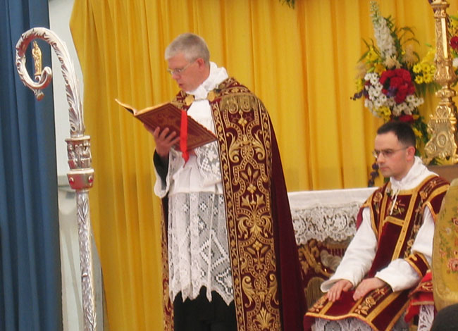 Entouré par ses deux assistants, les abbés Niklaus Pfluger et Alain-Marc Nély, le célébrant, Monseigneur Bernard Fellay, supérieur général de la Fraternité sacerdotale Saint-Pie X, était précédé, comme à l’accoutumée, par des prêtres ordonnés l’année précédente, officiant comme diacre et sous-diacre : les abbés Nicolas Cadiet et Christophe Legrier.