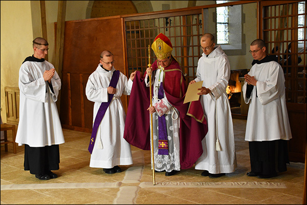 La consécration étant terminée, le pontife ressort en procession. L’autel va être orné de sa croix, des vases, des chandeliers et des fleurs. La messe pontificale commence alors avec la présence d’une centaine de fidèles venus dire leur confiance, leur soutien et leur fidélité aux Bénédictines de Perdechat et au clergé du monde de la Tradition.