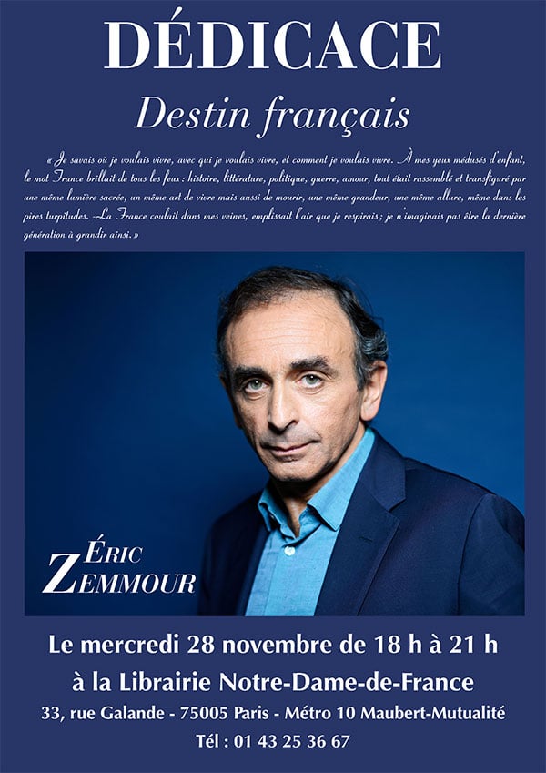 Le mercredi 28 novembre 2018 de 18 H 00 à 21 H 00, Monsieur Erci Zemmour signera son dernier ouvrage : Destin français [Aux Editions Albin Michel].