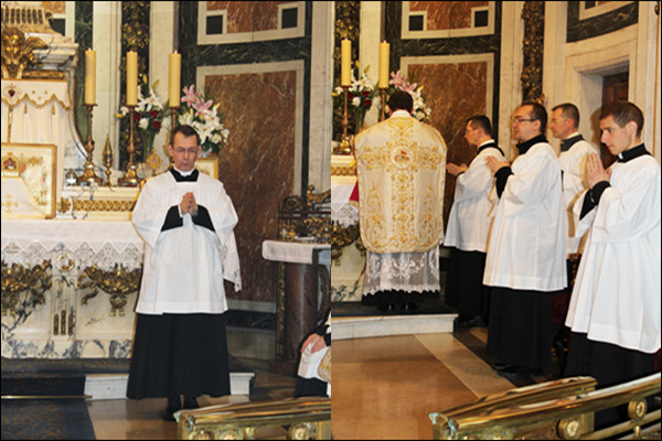 Photo 1 : à l’autel, le frère Marie-Dominique. Photo 2 : de gauche à droite, l’abbé Duverger ; le frère Marie-Dominique ; un religieux de la Maison Saint-Pie X de Suresnes ; le frère (de sang) du frère Marie-Dominique, remplissant le rôle de thuriféraire ; un autre religieux de Suresnes.