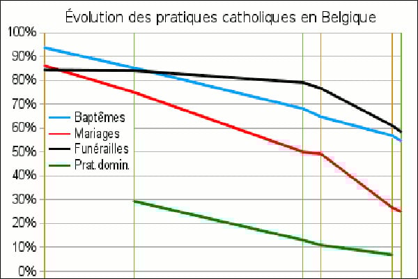 Au vu de l’évolution des cinquante dernières années, on peut conclure que le « retour du religieux » est très loin d’être une réalité en Belgique : baisse de la pratique, baisse de la croyance, baisse du sentiment d’être catholique, non compensée par la mise en place d’une « autre Église » voulue par le funeste Concile Vatican II.