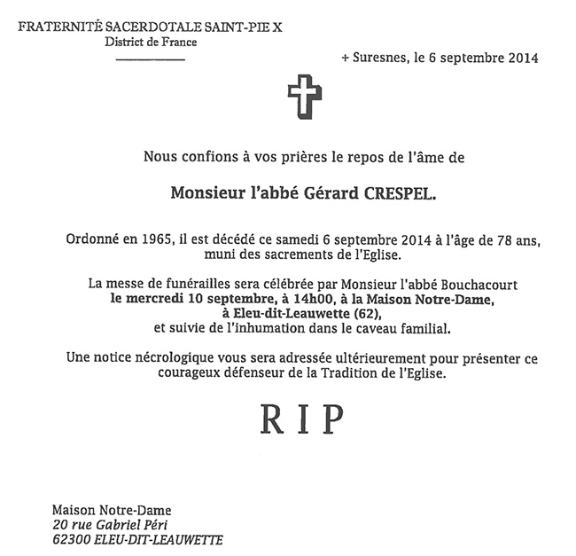 Avis de décès et de funérailles de M. l’abbé Gérard Crespel