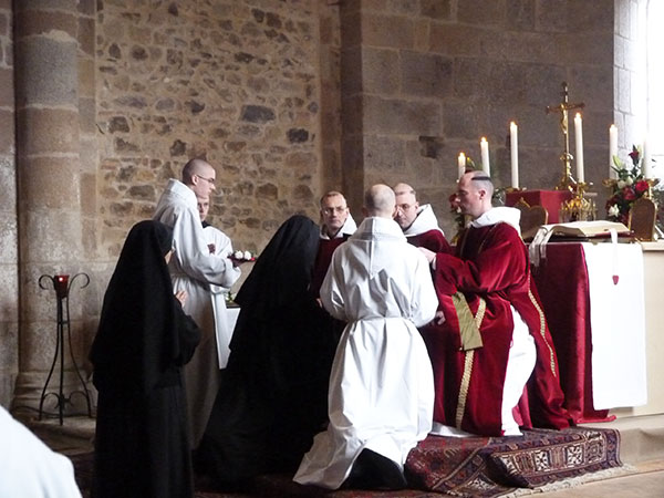 La consécration des vierges remonte aux temps antiques du IVe siècle. D’abord pour toute religieuse dans le monde, la cérémonie fut ensuite réservée aux soeurs cloîtrées, mais finit par être abandonnée auXII° siècle, au temps de sainte Gertrude, sauf chez les cisterciennes et les chartreuses. Dom Guéranger devait restaurer cette consécration au xixe siècle, l’unissant à l’émission des vœux perpétuels. Cette longue cérémonie, chantée de bout en bout, rassemble des textes de la tradition chrétienne et monastique la plus vénérable : la remarquable préface consécratoire, composée par saint Léon le Grand pour la consécration de sa propre soeur, en est le sommet, mais aussi une dizaine d’antiennes tirées de l’office de sainte Agnès, leur modèle, avec le célèbre Veni, sponsa Christi. Les religieuses étant assimilées à des diacres, la consécration se place au cœur de la messe entre le graduel et l’alléluia. Les vierges s’avancent, cierge en main – les vierges sages de l’Évangile – et se prosternent durant les litanies des saints. Elles sont consacrées par la préface puis reçoivent les insignes, voile, coule, anneau, couronne de fleurs et enfin le bréviaire car, comme les diacres, elles sont appelées à chanter les louanges divines pour l’Église ex officio.
