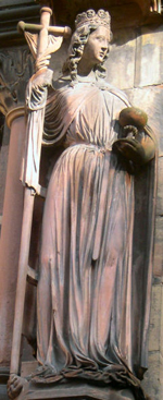 – A droite la Synagogue vaincue tient une lance brisée, détourne sa tête aux yeux bandés, expression de son refus de reconnaître dans le Christ le Messie attendu. Elle paraît laisser tomber les tables de la Loi, symbole de l’Ancien Testament dépassé.