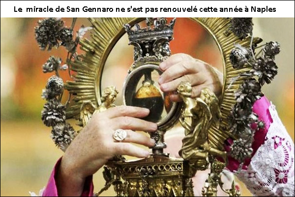 En effet, les exemples dans l’histoire récente où le sang ne s’est pas liquéfié abondent : en septembre 1939, quelques semaines après le début de la Seconde Guerre mondiale ; en septembre 1940, en correspondance avec l’entrée de l’Italie dans le conflit ; en septembre 1943, date de l’occupation nazie, ; en septembre 1973, avant l’éclatement d’une épidémie de choléra à Naples ; ainsi qu’en septembre 1980, un mois avant qu’un terrible tremblement de terre ne frappe Irpinia, près de Naples, faisant près de 3.000 morts.
