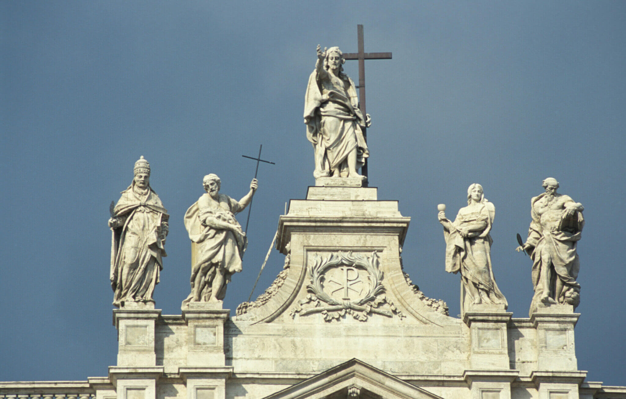 La basilique Saint-Jean-de-Latran est dédiée aux deux grands saints proches de Notre Seigneur et prénommés Jean : saint Jean-Baptiste et saint Jean l’Apôtre. Au sommet du frontispice, au-dessus de l’entrée, se trouve la statue du Christ Sauveur. Saint Jean-Baptiste est placé à sa droite et l’apôtre saint Jean à sa gauche.