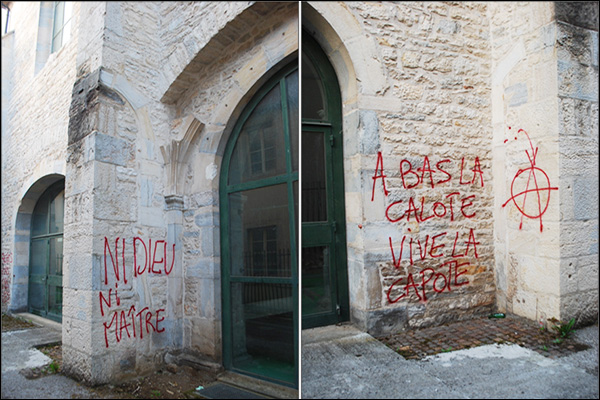La haine anti-catholique vient de se manifester en souillant les murs de notre nouvelle chapelle de Besançon.
