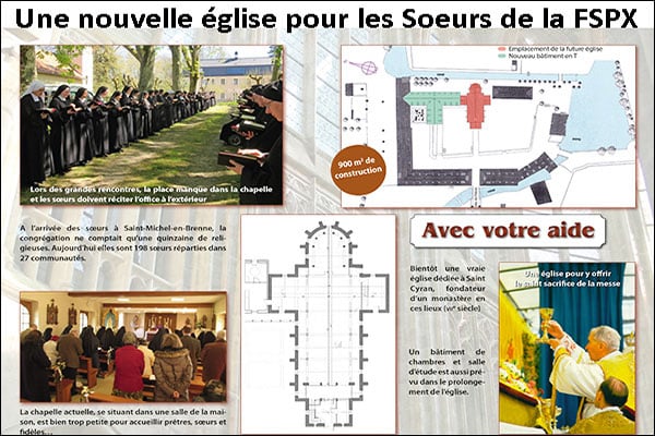 La chapelle actuelle, se situant dans une salle de la maison, est bien trop petite pour accueillir prêtres, soeurs et fidèles… Avec votre aide Bientôt sera érigée une vraie église dédiée à Saint Cyran, fondateur d’un monastère en ces lieux (VIIIe siècle) auquel sera adjoint unbâtiment de chambres et salle d’étude dans le prolongement de l’église.