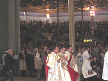 Quant à moi, mes biens chers frères, si vous le permettez, en votre nom à tous à l’occasion de ce Pèlerinage de la Tradition, je voudrais remercier Notre-Dame, la remercier de nous avoir encore rassemblés ici cette année. Et je voudrais la remercier pour ce qu’on appelle la Tradition, pour ce rassemblement dont je suis tellement persuadé qu’il va être l’occasion de très nombreuses grâces qui vont venir fortifier les âmes, et donc fortifier la Tradition, les orienter vers le Bon Dieu davantage, leur insuffler comme un souffle nouveau dans la belle mission qui nous est impartie à nous, catholiques de la Tradition, en cette période. Je veux la remercier pour toute la Tradition dont je suis content de dire que les foules, qui se pressent ici davantage cette année et grossissent d’année en année, illustrent en réalité l’ouvre profonde qui s’accomplit dans ses ouvres, et dont profitent les âmes. Mes bien chers frères, je partagerai avec vous la joie, par exemple, de savoir qu’en cette rentrée scolaire 2004, jamais depuis le début de son existence, le District de France de la Fraternité n’a scolarisé autant d’enfants dans ses écoles. Quel signe d’espérance pour nous que de savoir que le travail de nos confrères sur le terrain, dans toutes les écoles, est un travail qui va permettre à tant d’enfants de vivre ainsi d’une façon qui leur donnera de se fortifier d’abord dans ces milieux de grâces, dans ces milieux privilégiés que sont les écoles catholiques traditionnelles, et que dans ce terreau les belles vocations du Bon Dieu pourront germer, et que se prépareront aussi ces pères et ces mères de famille qui sont l’espérance de la Tradition.