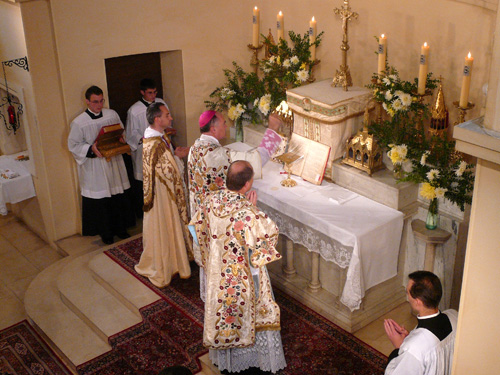 Mgr Bernard Fellay secondé par Messieurs les abbés de Cacqueray, Petrucci, Laurençon et Bonneterre.