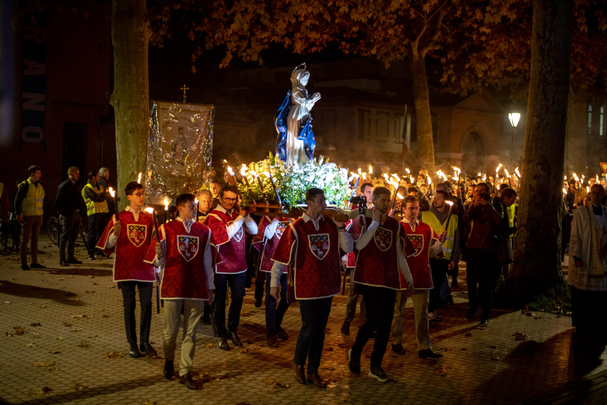Pour la première fois, une procession traditionnelle a été organisée à Toulouse en l’honneur de l’Immaculée Conception, le soir du 8 décembre. Les participants ont commencé à se regrouper vers 20h, près du jardin Royal et ils ont pu récupérer leurs flambeaux. La météorologie était des plus clémentes sans froid, ni pluie, ni vent : le Ciel veillait sur nous. Plus de 250 personnes se sont ainsi rassemblées, guidés par un service logistique très au point et accueillies par quatre cavaliers : Les quatre chevaux blancs ont été particulièrement appréciés pour leur prestance par les petits et les grands. La procession s’est alors élancée derrière la statue de Notre-Dame portée par une garde d’honneur aux armes de la ville de Toulouse et encadrée par son escorte équestre.