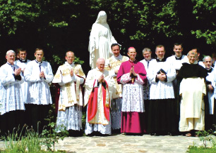 En tête, ces jeunes séminaristes, pour la plupart issus des écoles dont Monseigneur avait pressenti très justement l’importance pour l’éclosion et la préservation des nouvelles vocations ; puis les prêtres, au nombre d’une quarantaine, venus de partout témoigner leur reconnaissance à un père commun ; ensuite, le révérend père Baillif, figure de tous ces anciens qui préférèrent le salut de la Sainte Église et la préservation complète du dépôt de la Foi à leur confort et à la tranquillité personnelle ; enfin, Monseigneur Tissier de Mallerais, encadré de deux prêtres assistants. En somme, une parfaite illustration de la Tradition.