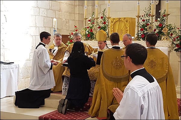 C’est Mgr Tissier de Mallerais, évêque auxiliaire de la Fraternité Sacerdotale Saint-Pie X, qui officiait lors d’une messe pontificale célébrée en l’église abbatiale de Ruffec acquise et restaurée par les religieuses. Il était assisté de Messieurs les abbés Christian Bouchacourt, Supérieur du District de France et prêtre Assistant, Patrick Troadec et Michel Simoulin, diacres-assistant.