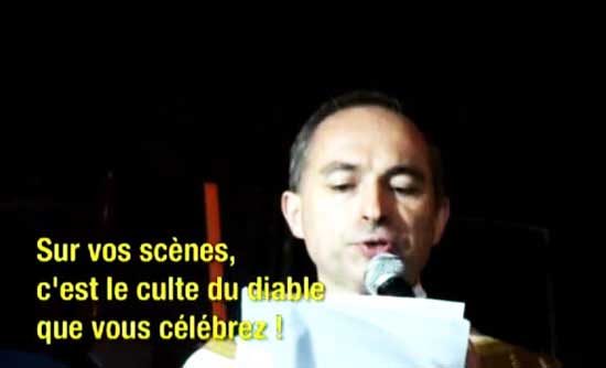 Nous irons vite. Nous allons donner des signes, des exemples et des preuves de cette dimension religieuse radicalement inversée qui est la véritable source d’inspiration de l’anti-art contemporain. Sur vos scènes, c’est le culte du diable que vous célébrez, vous y cultivez un satanisme réel, un satanisme qui a été publiquement avoué. Ce soir, nous voulons arracher le masque de cette libre-pensée que vous affichez pour dénoncer la présence de ce satanisme subventionné qui se tient dans vos théâtres devenus, pour l’occasion, des temples sataniques.