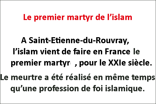 A Saint-Etienne-du-Rouvray, l’islam vient de faire en France le premier martyr, pour le XXIe siècle. Un homme a été tué, égorgé, non plus prétendument pour des raisons politiques, mais bel et bien en haine de la foi. C’était dans une église, cela s’est passé durant une messe, il s’agissait d’un prêtre, et le meurtre a été réalisé en même temps qu’une profession de foi islamique. Le martyre au sens canonique est donc parfaitement caractérisé.