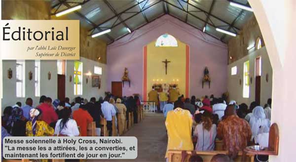 Le Kenya n’échappe pas à la règle. La fondation du prieuré se fit lentement, à partir d’un tout petit groupe de fidèles qui depuis longtemps réclamait la présence de la Fraternité. Ce petit groupe a grandi. Le prieuré s’est déplacé en centre-ville (1) l’église Sainte-Croix a été construite et bientôt, sans publicité, sans haut-parleurs hurlant des prédications folles, sans céder aux modes des danses et des tam-tam liturgiques, les âmes de bonne volonté arrivent, découvrent la liturgie de toujours. Elles trouvent alors dans la messe le repos, la force pour persévérer dans le combat quotidien. La messe les a attirées, les a converties, et maintenant les fortifient de jour en jour.