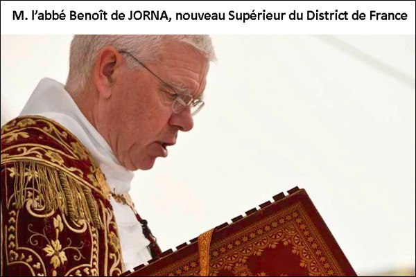 Par décision de M. l’abbé Davide PAGLIARANI, Supérieur Général de la Fraternité Sacerdotale Saint-Pie X, M. l’abbé Benoît de JORNA est nommé Supérieur du District de France.
