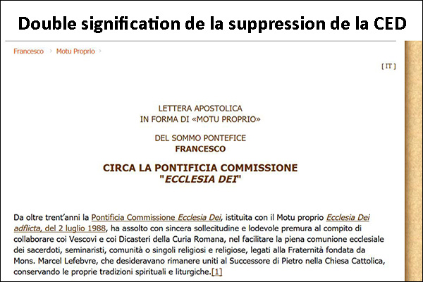 Ainsi, pour Andrea Tornielli, « le Motu proprio par lequel le Pape François a supprimé la Commission pontificale Ecclesia Dei en attribuant ses compétences à une section spécifique de la Congrégation pour la doctrine de la foi a une double signification ».