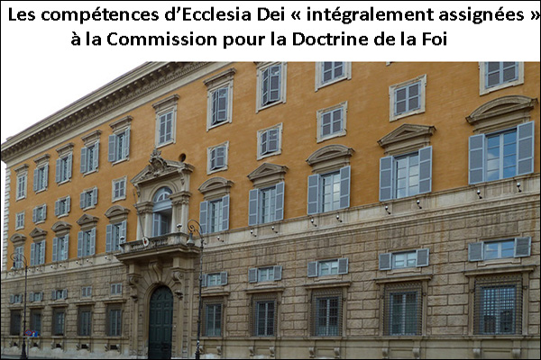Concrètement, les compétences d’Ecclesia Dei « sont intégralement assignées » à la CDF dont elle devient une section à part entière – aux côtés des sections doctrinale et disciplinaire et des archives.