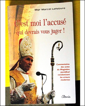 - C’est moi, l’accusé, qui devrais vous juger ! – Dès les débuts de la Fraternité Saint-Pie X, Mgr Lefebvre institua, pour la formation dispensée aux séminaristes, un cours très particulier donné en première année qui s’intitulait : Actes du Magistère. Ce cours exposait les grandes encycliques des papes et les documents pontificaux traitant de l’ordre social chrétien et de la royauté de Notre-Seigneur sur la Cité. Au cours des années 1979–1982, Mgr Lefebvre enseigna lui-même cette matière au séminaire d’Ecône. C’est le cours donné en 1980–1981 qui a été transcrit par les soins de M. et Mme André Cagnon, en faisant appel toutefois aux cours de 1979–1980 pour le commentaire sur Quanta Cura et le Syllabus. Dans une première édition, Mgr Bernard Tissier de Mallerais a arrangé légèrement la forme du texte, y ajoutant quelques précisions, tout en gardant le style parlé, dans le but de rendre l’exposé aussi clair et ordonné que possible. Dans cette nouvelle édition, les éditions Clovis ont choisi de rendre le style davantage proche de l’écriture et encore plus apte à la compréhension, tout en veillant à garder soigneusement le sens voulu par l’auteur.[↩]
