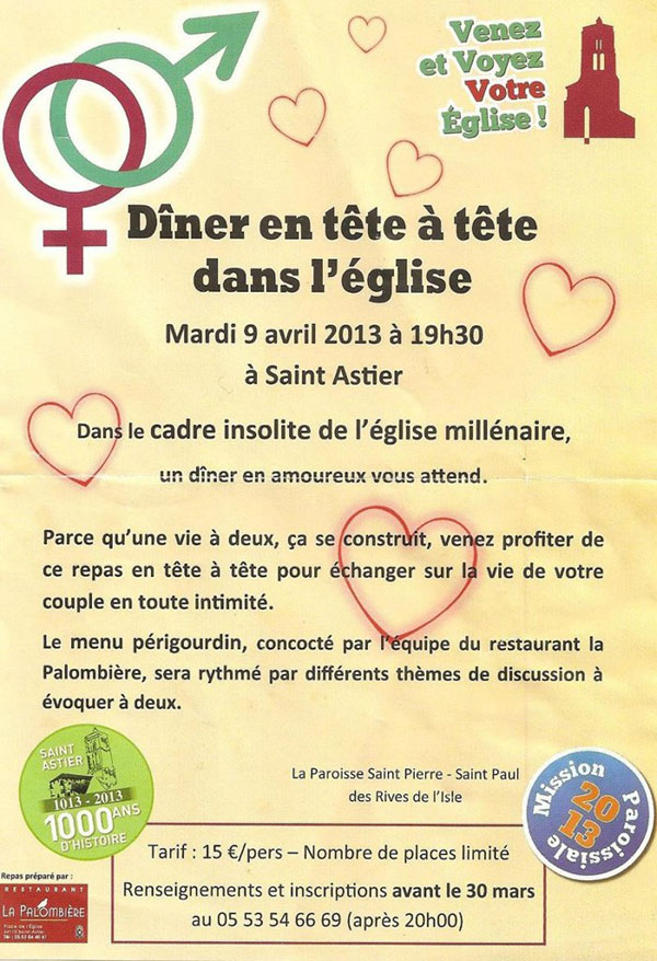 Le Père Sébastien a cru pouvoir atténuer le caractère profondément choquant de cette manifestation en indiquant que ce repas serait animé par les prêtres et qu’en conséquence il aurait une tout autre signification que ce qui est annoncé. Cette casuistique n’abusera personne si ce n’est la pauvre clientèle qui sera abusée par un tract mensonger en ne pouvant pas profiter tranquillement « de ce repas pour échanger sur la vie de leur couple en toute intimité« . La question se pose même de savoir s’il n’y a pas une volonté délibérée de choquer, tant cette organisation est absurde : il serait si simple en effet de faire le tout au restaurant lui même qui est équipé en conséquence et où les animateurs ecclésiastiques pourraient déployer tous leurs talents.
