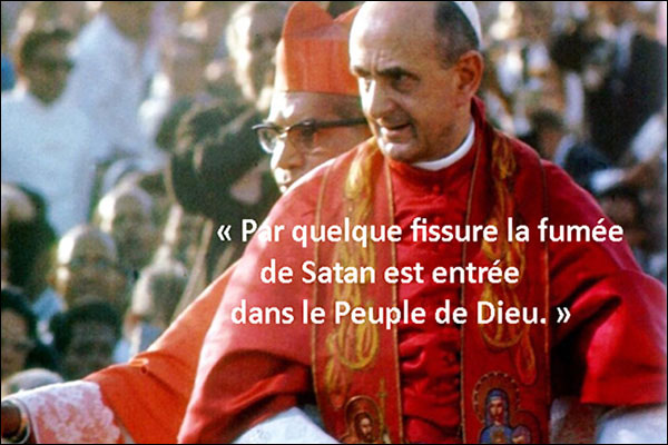 7. En tout état de cause, la formule si souvent reprise doit prendre son sens à la lumière de tout ce contexte. « Par quelque fissure », dit le Pape, « la fumée de Satan est entrée dans le Peuple de Dieu. » Oui : non point dans la sainte Église, mais dans le « Peuple de Dieu », au sens que Paul VI donne à cette expression, dans tout le reste de son discours, Peuple sacerdotal, dont la vocation est de consacrer le monde à Dieu, par le dialogue et par une découverte toujours nouvelle. Et ce Peuple de Dieu doit lui-même s’entendre comme l’un des fruits privilégiés du Concile. « Nous croyons », dit encore le Pape comme pour conclure son homélie, « à quelque chose de préternaturel qui est venu dans le monde précisément pour troubler, pour étouffer les fruits du concile oecuménique et pour empêcher l’Église de chanter sa joie d’avoir repris pleinement conscience d’elle-même [11]. » On retrouve d’ailleurs le même constat dans la mise en garde du Conseil permanent de l’épiscopat français du 8 décembre 1976, contre le livre de Michel de Saint- Pierre, Les Fumées de Satan : « Le Concile, malgré certains abus qui se sont produits sous le couvert de ses réformes, a permis à beaucoup de catholiques, en un temps où la foi est difficile, de mieux vivre l’Évangile et de mieux l’annoncer [12]. » Le concile Vatican II n’est donc pas coupable, il est innocent de la crise de l’Église. Le vrai coupable, ce sont les « fumées de Satan », qui ont empêché le Peuple de Dieu de prendre conscience de lui-même. Le tour est joué.