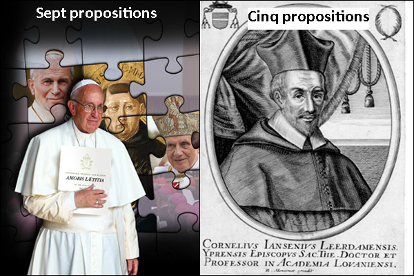 1. Non plus cinq, mais sept. Il y eut en effet jadis cinq pro­po­si­tions héré­tiques : comme telles, elles furent condam­nées par un Pape, et pas seule­ment dénon­cées par une cer­taine élite du cler­gé et des fidèles catho­liques. L’épisode est res­té non seule­ment célèbre, mais aus­si emblé­ma­tique d’une dif­fi­cul­té qua­si­ment inso­luble. Les mêmes causes pro­dui­sant les mêmes effets, il est bien à craindre que le scan­dale (car c’en est un) sus­ci­té par Amoris læti­tia ne soit pas près d’être répa­ré comme il le mérite.