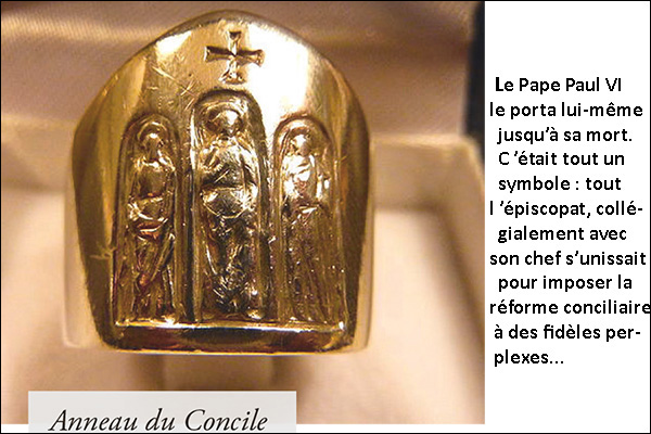 Mais revenons à l’anneau du Concile. Le pape Paul VI l’offrit à tous les évêques du monde le 6 décembre 1965, avant-veille de la clôture de Vatican II. Beaucoup se mirent à le porter à la place de leur anneau épiscopal. Le pape lui-même le porta jusqu’à sa mort abandonnant le traditionnel anneau du pécheur. C’était tout un symbole : tout l’épiscopat collégialement avec son chef s’unissait pour imposer la réforme conciliaire à des ; fidèles perplexes.