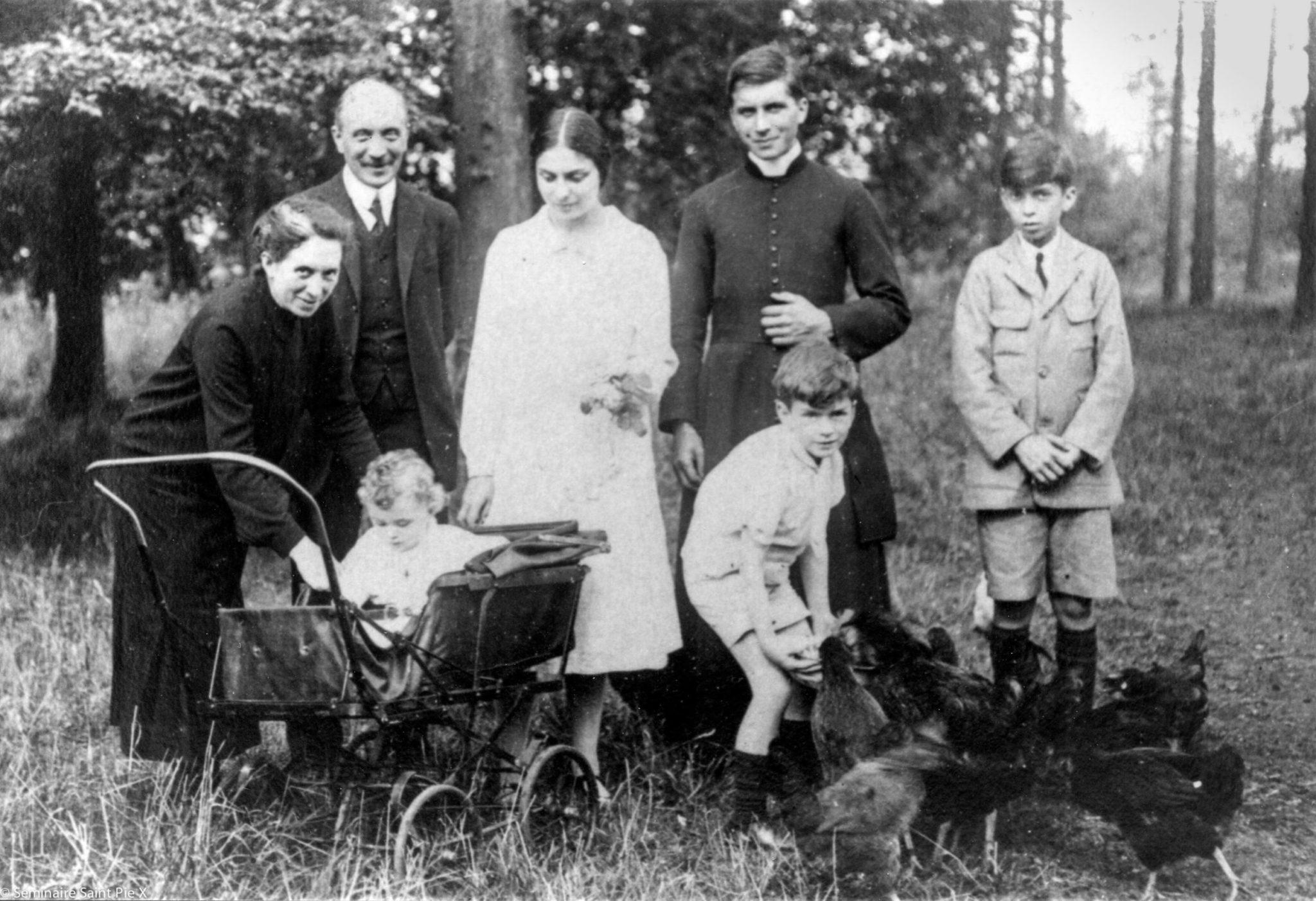 — Bien mon fils, je m’en dou­tais un peu, mais je ne t’en ai jamais par­lé de moi-​même, pour ne pas t’influencer. Si telle est ta voca­tion, Fiat ! Deo gra­tias ! Tu vois, le bon Dieu me retire mes enfants l’un après l’autre : ton frère aîné est novice à Orly chez les pères spi­ri­tains, ta sœur Jeanne va entrer chez les Soeurs de Marie-​Réparatrice ; ta soeur Bernadette pense aux soeurs mis­sion­naires du Saint-​Esprit, et Christiane songe au car­mel ! Mais allons par­ler à ta mère !