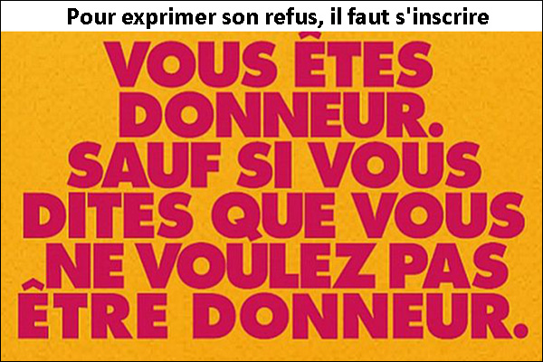 Toute personne majeure qui serait opposée au don d’organes devra donc désormais faire connaître de son vivant son refus, soit par l’inscription sur le Registre national du refus, soit selon des modalités qui seront précisées dans un décret en Conseil d’État à paraître au plus tard le 1er janvier 2017. Et l’entrée en vigueur des nouvelles dispositions ne sera effective qu’à partir du 1er janvier 2018 afin de laisser un délai d’information du public sur la loi et les modalités d’expression du refus.