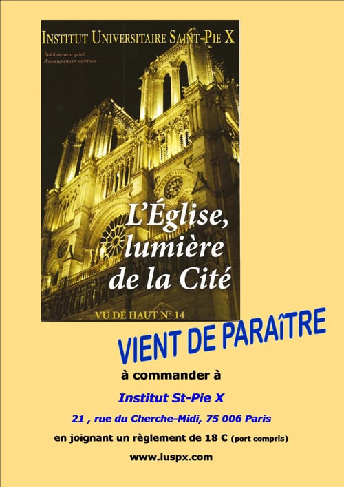 Les parutions de l'Institut Universitaire Saint-Pie X Vu de Haut n° 12Vu de Haut n° 13Vu de Haut n° 14 Actes du colloque d'octobre 2009 Avec notamment : une conférence du Professeur Jean de Vigu...