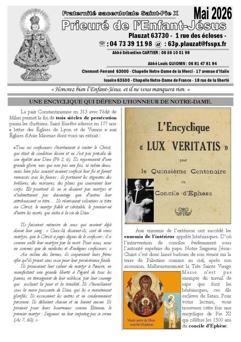 Plauzat Prieuré de l'Enfant-Jésus FSSPX District de France 1, rue des Écloses 63730 Plauzat +33 4 73 39 11 98 [email protected]