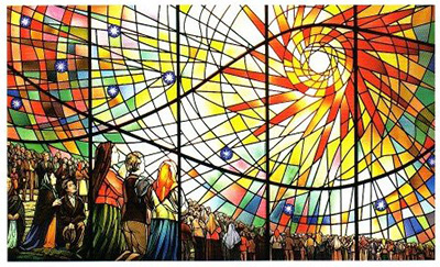 Pendant que Notre-Dame s’élevait, le reflet de la lumière qui se dégageait d’Elle se projeta sur le soleil. C’est à ce moment que la foule put contempler la danse du soleil : la pluie cessa soudainement et les nuages se dispersèrent brusquement, laissant apparaître un ciel clair. La foule put alors regarder directement le soleil sans risque de se brûler les yeux ni sans être aucunement incommodé. Devant ce si grand miracle, défiant toutes les lois de la nature, il y avait un grand silence. L’astre se mit à trembler avec des mouvements brusques, puis il tourna sur lui-même à une vitesse vertigineuse, en lançant des gerbes de lumière de toutes les couleurs de l’arc-en-ciel. Il semblait s’approcher de la terre, au point que la foule s’en inquiéta. En effet, le soleil, conservant son mouvement rapide de rotation, paraissait brusquement se détacher du ciel et avancer en zigzaguant sur la foule. Ce fut un instant si terrible que plusieurs personnes s’évanouirent, mais finalement il s’arrêta au grand soulagement de tous.