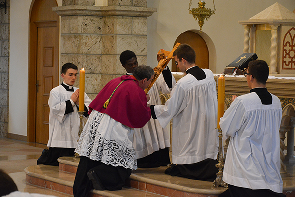 Descendant le corps de la croix pour le remettre à sa mère, Nicodème n’ose lui prononcer la terrible parole : « Voici ton fils », même si hélas la terrible réalité est là. Mais elle n’est pas que là. « Voici ton fils » : cette parole, elle l’a entendue, mais de la bouche de Jésus. Elle désignait saint Jean, prêtre depuis la veille. Quoique mort, et avant même sa résurrection, Jésus n’a donc pas totalement quitté sa très sainte Mère. La présence agissante et aimante de Jésus auprès d’elle se perpétuera désormais à travers le prêtre, à travers tout prêtre ; pour la très sainte Vierge, qui jour après jour communiera de la main de saint Jean, comme pour nous tous.