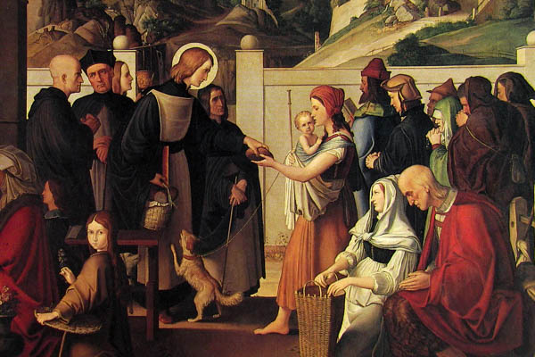 Roch, d’une noble famille de Montpellier, naquit au début du XIVe siècle. Orphelin à vingt ans, il distribua aux pauvres la plus grande partie de sa fortune, prit un habit de mendiant et entreprit le pèlerinage de Rome. L’Italie était alors désolée par la peste ; saint Roch s’arrêta en divers hôpitaux pour soigner les victimes et en guérir plusieurs par le simple signe de la croix. A Plaisance, il fut atteint lui-même de la contagion et se retira dans une forêt écartée où un chien lui apportait chaque jour un pain. Dieu le guérit, saint Roch put rentrer à Montpellier, mais tellement méconnaissable que son oncle le fit jeter dans un cachot comme espion. Il y mourut au bout de cinq ans, vers 1337. Il fut identifié par sa grand- mère en raison d’une tache de vin en forme de croix qu’il portait sur sa poitrine depuis sa naissance. On l’honora aussitôt comme un saint et on l’invoqua contre la peste et les maladies contagieuses. Il est fêté le 16 août.