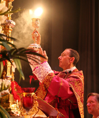 Ensuite, on nous dit que le Christ au cours de la Messe est rendu présent, oui, mais rendu présent avec tous Ses mystères salvifiques et non pas par l’œuvre (soi-disant) « magique » de la Consécration, qui est une œuvre « magique », mais par le vécu de l’action liturgique communautaire qui objective les mystères du Christ. Ainsi, donc, le mystère du Christ, en particulier le mystère pascal, devient le mystère du culte. Voilà ce qu’on nous dit, en particulier Mgr Hannibal Bugnini, cheville ouvrière de la réforme liturgique. Donc il ne s’agit pas de consacrer le Corps et le Sang du Christ, mais d’évoquer ensemble, activement, communautairement, liturgiquement tout le mystère du Christ, en particulier Son mystère Pascal, donc en mettant en évidence la Résurrection et l’Ascension du Christ.