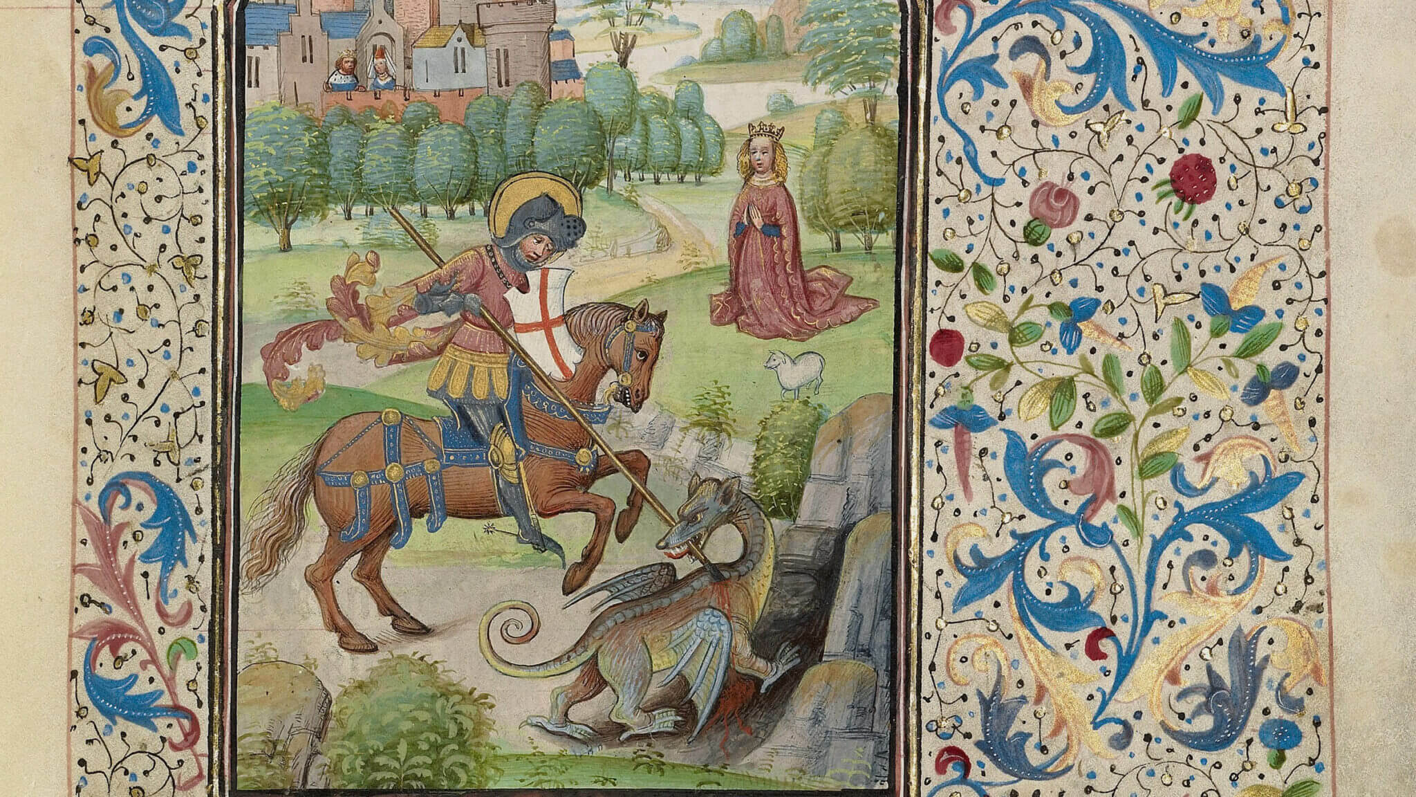 Un manuscrit du XIIIème siècle et la Légende dorée du bienheureux Jacques de Voragine attribuent au jeune officier un exploit merveilleux et chevaleresque. Georges, en route pour rejoindre sa légion, arrive dans la ville de Silène, en Libye. Un marais des environs abritait un dragon énorme que personne n’avait encore réussi à tuer. Pour l’empêcher de dévaster la ville et la campagne avoisinante, on lui abandonnait chaque jour deux brebis. Ces dernières menaçant de manquer, le roi de l’endroit décida d’en remplacer une par une jeune fille tirée au sort. Un jour la fille même du roi fut désignée. Malgré la douleur de son père, elle dut s’exécuter comme les autres. Elle s’achemina en pleurant vers le repaire de la bête. A ce moment parut un beau cavalier, armé de l’épée et de la lance. Quand il eut connaissance du sort réservé à la jeune fille, il fit le signe de la croix et fonça courageusement sur le monstre furieux. D’un vigoureux coup de lance il le transperça ; puis, lui faisant avec la ceinture de la jeune fille un lien vigoureux et protecteur, il fit conduire le dragon jusque dans la ville. Là, il expliqua au roi et à son peuple pourquoi il avait pu terrasser leur grand ennemi : il avait invoqué le secours du seul Dieu véritable. Tous promirent de croire en Jésus-Christ et de se faire baptiser, et Georges donna alors à la bête infernale le coup de grâce.
