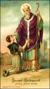 Saint Germain est né près d’Autun vers l’an 496, d’Eleuthère et Eusébie, riches et catholiques, quoiqu’Eusébie ait essayé de le perdre en prenant des « remèdes » pour ne pas avoir trop d’enfants. Elle le maltraitera par la suite. Une sienne grand’mère alla jusqu’à tenter de l’empoisonner… Son cousin prêtre, Scapilion, l’éduqua chrétiennement à Luzy. Habitant à une demi-lieue de l’église, Germain ne manquait pas à matines et à la Messe.