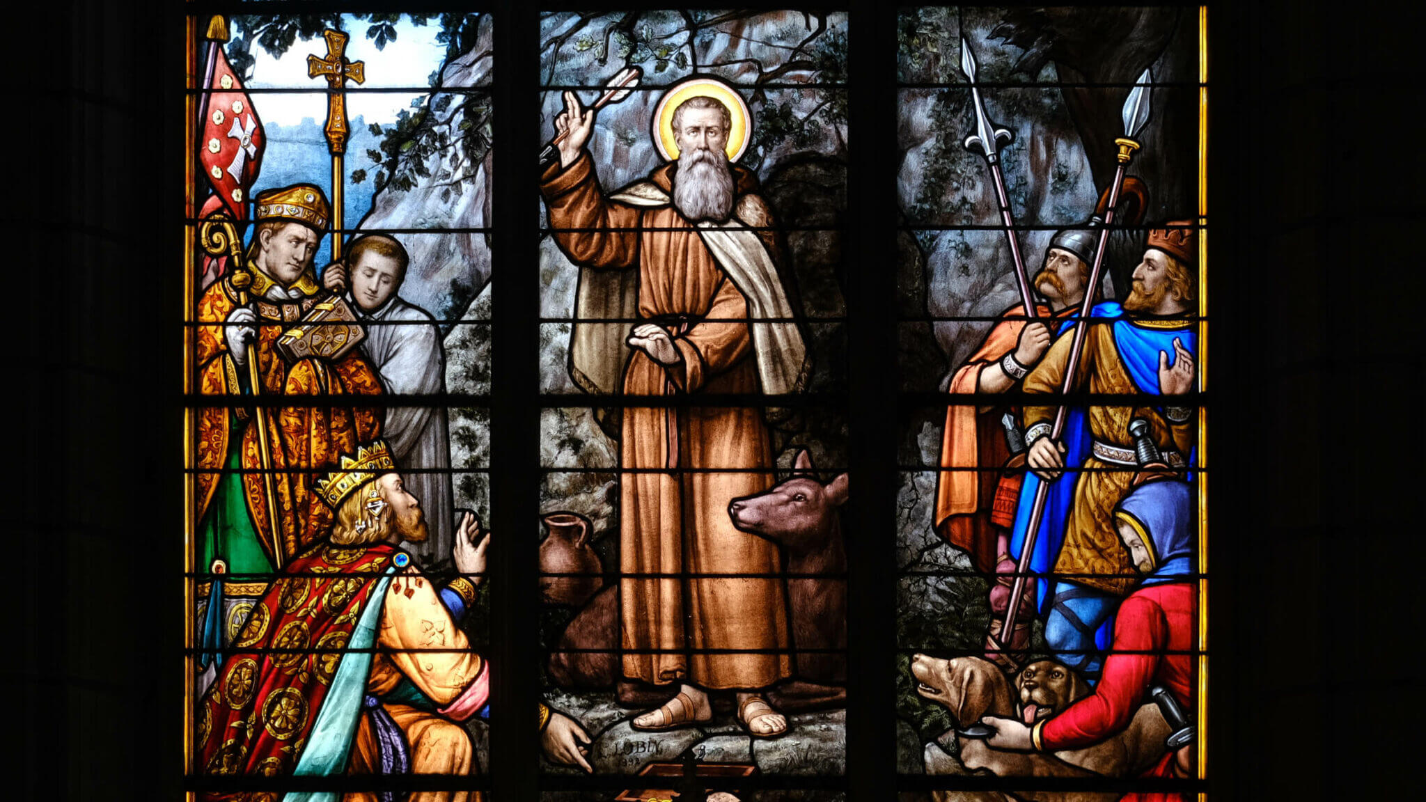 Un jour qu’accompagné d’une suite nombreuse il chassait dans la forêt, ses chiens poursuivirent la biche qui nourrissait Gilles. Exténuée de fatigue, près de tomber sous les coups des chasseurs, la pauvre bête accourut vers la grotte et, poussant des gémissements, implora le secours du Saint. Celui-ci sortit de la caverne : il entendit les aboiements des chiens et les cris des chasseurs… A la pensée du péril qui menaçait la biche, son cœur fut saisi de douleur ; il leva ses regards vers le ciel et, en versant des larmes, supplia le Seigneur de conserver la vie à cet innocent animal. Cependant, les chiens ne cessaient d’aboyer, sans néanmoins avancer vers la grotte… Un des chasseurs, pour faire sortir la biche de sa retraite, décocha une flèche à travers les broussailles. Elle atteignit à la main le serviteur de Dieu. Le roi, touché d’une crainte secrète et pressé par la nuit, se retira.