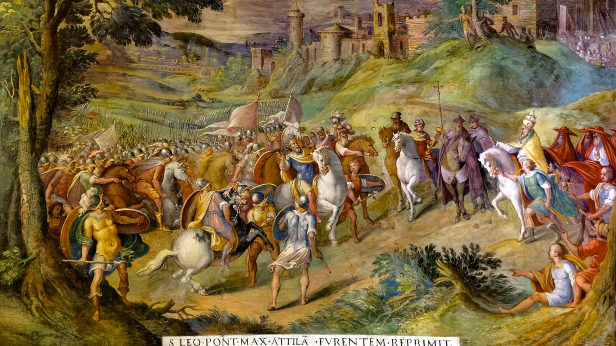 Devenu maître d’Aquilée au printemps de l’année 452, il la réduisit en cendres et mit le pays à feu et à sang ; puis, continuant ses ravages, il saccagea Milan et s’empara de Pavie. L’empereur Valentinien III et sa cour quittèrent précipitamment Ravenne et vinrent s’enfermer dans Rome. L’empereur, le Sénat, le peuple, saisis d’effroi, ne virent qu’un sauveur possible : Léon.